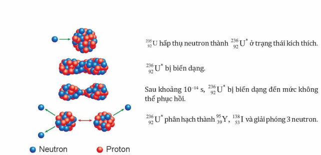 Năm 1939, Otto Hahn (Őt-tô Han) đã làm thí nghiệm dùng neutron nhiệt (động năng nhỏ hơn 0,1 eV) bắn vào \({}_{92}^{235}\text{U}\). Kết quả cho thấy hạt nhân \({}_{92}^{235}\text{U}\) vỡ thành hai hạt nhân có khối lượng nhỏ hơn. Kèm theo quá trình phân hạch này có một số neutron được giải phóng (Hình 22.6).