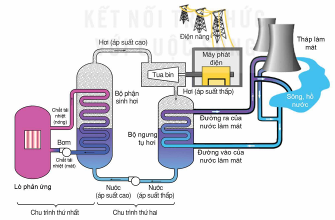 Năng lượng toå ra trong các phản ứng hạt nhân thường được chuyển hoá thành điện năng thông qua hệ thống lò phản ứng hạt nhân, tua bin và máy phát điện để hoà vào lưới điện hoặc cung cấp năng lượng cho tàu ngầm, tàu phá băng... Hệ thống khai thác năng lượng hạt nhân có thế hoạt động trong thời gian dài mà không cần bổ sung nhiên liệu. Bộ phận chính của nhà máy điện hạt nhân là lò phản ứng hạt nhân. Chất tải nhiệt sơ cấp, sau khi chạy qua vùng tâm lò, sẽ chảy qua bộ trao đổi nhiệt, cung cấp nhiệt cho lò sinh hơi. Hơi nước làm chạy tua bin phát điện giống như trong nhà máy điện thông thường (Hình 24.1).